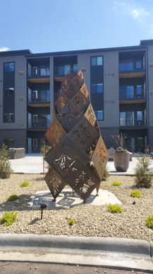 12 feet tall | Cor-ten SteelThis was commissioned for a Luxtury apartment complex: Cedar Ridge. Each of the 40 squares have cut-outs of cedar leaves. 8 levels of 5 squares each. The Cor-ten will continue to rust to a beautiful deep dark red.