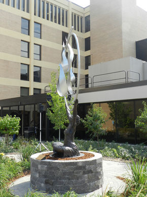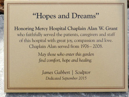 2015 | 11.5 ft x 8 ft x 3 ft | Bronze and stainless steel | $150,000 | Located at Mercy Hospital in Coon Rapids, MN. The women is bronze and the "dreamcatcher" is stainless steel. The intention of this commission was to honor, but not portray, Mercy Hospital's beloved long time Chaplain. The sculpture emerged through numerous conversations. His widow said he believed God was a "big loving mama". This became the larger than life-size, plus-size woman sitting and approachable with a ready lap. His successor told me he was deeply involved in the design of the Chapel's stained-glass window: a contemporized "dreamcatcher". I echoed the idea and composition with the dreamcatcher element. I learned the hospital staff voted to name the new garden: "Hope Garden". This became the figure's pose as an expression of hope. Always in mind was the support for patients and their families who seek solitude and strength from this Garden. These ideas, gleaned from multiple conversation came together to create "Hopes and Dreams".
